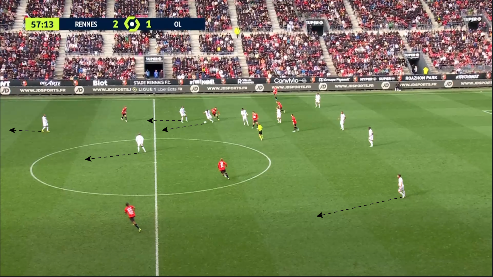 Con posesión de balón superior a la del Rennes, el Lyonnais jugaron poco en transición, pero cuando lo hicieron fue incisivo y directo. La relación entre los dos atacantes del Lyon volvió a destacarse.