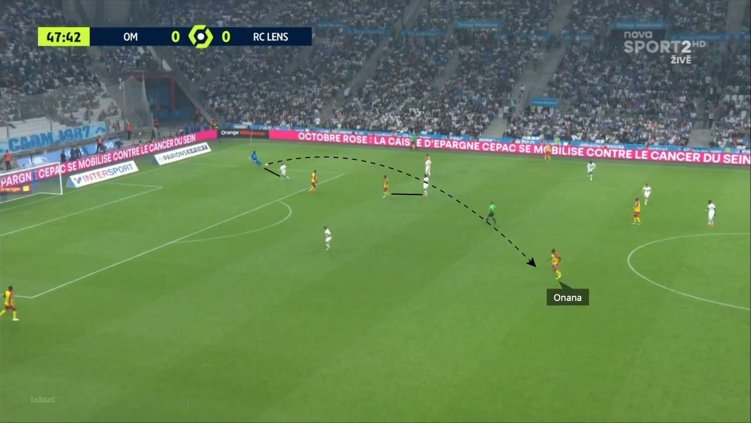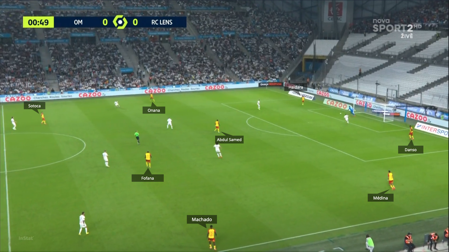 Vemos un plan de juego ligeramente diferente para Lensois aquí de lo habitual: el centrocampista se ha reforzado esta vez con el titular Jean Onana en lugar de David Pereira Da Costa. Fue Seko Fofana quien asumió el papel de este último moviéndose un poco más arriba.