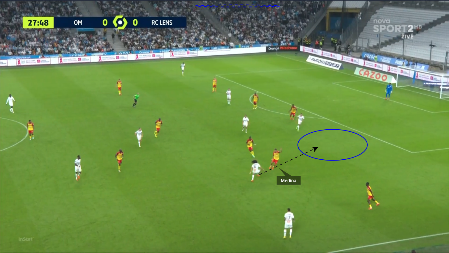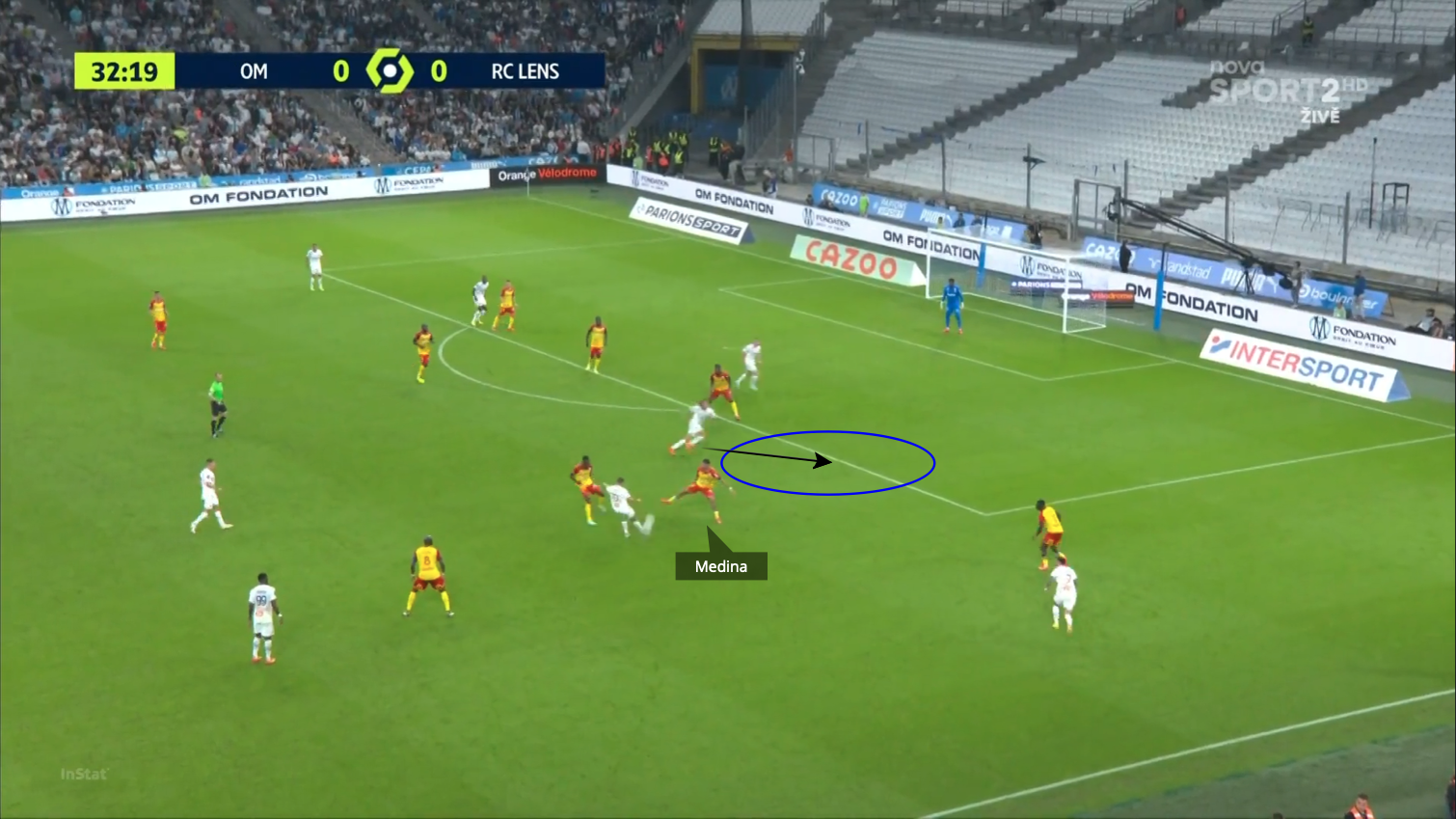 El objetivo era golpear a este jugador en esta zona, es decir, por detrás de los tres centrocampistas del Lensois pero por delante de los centrales.