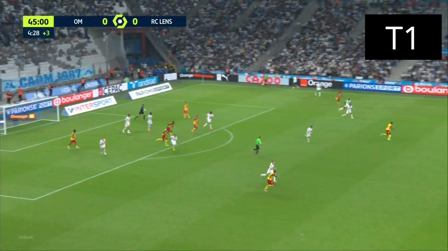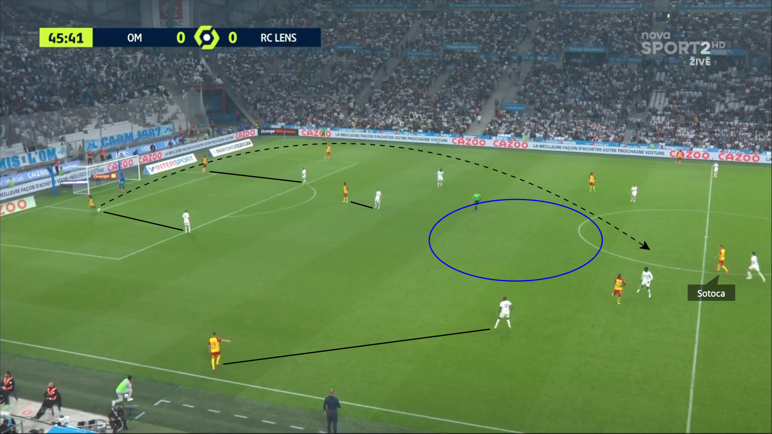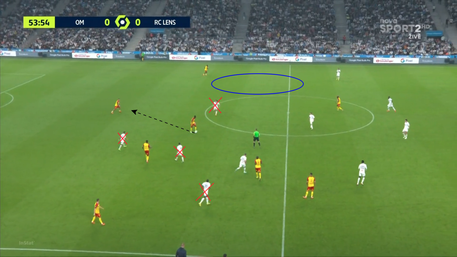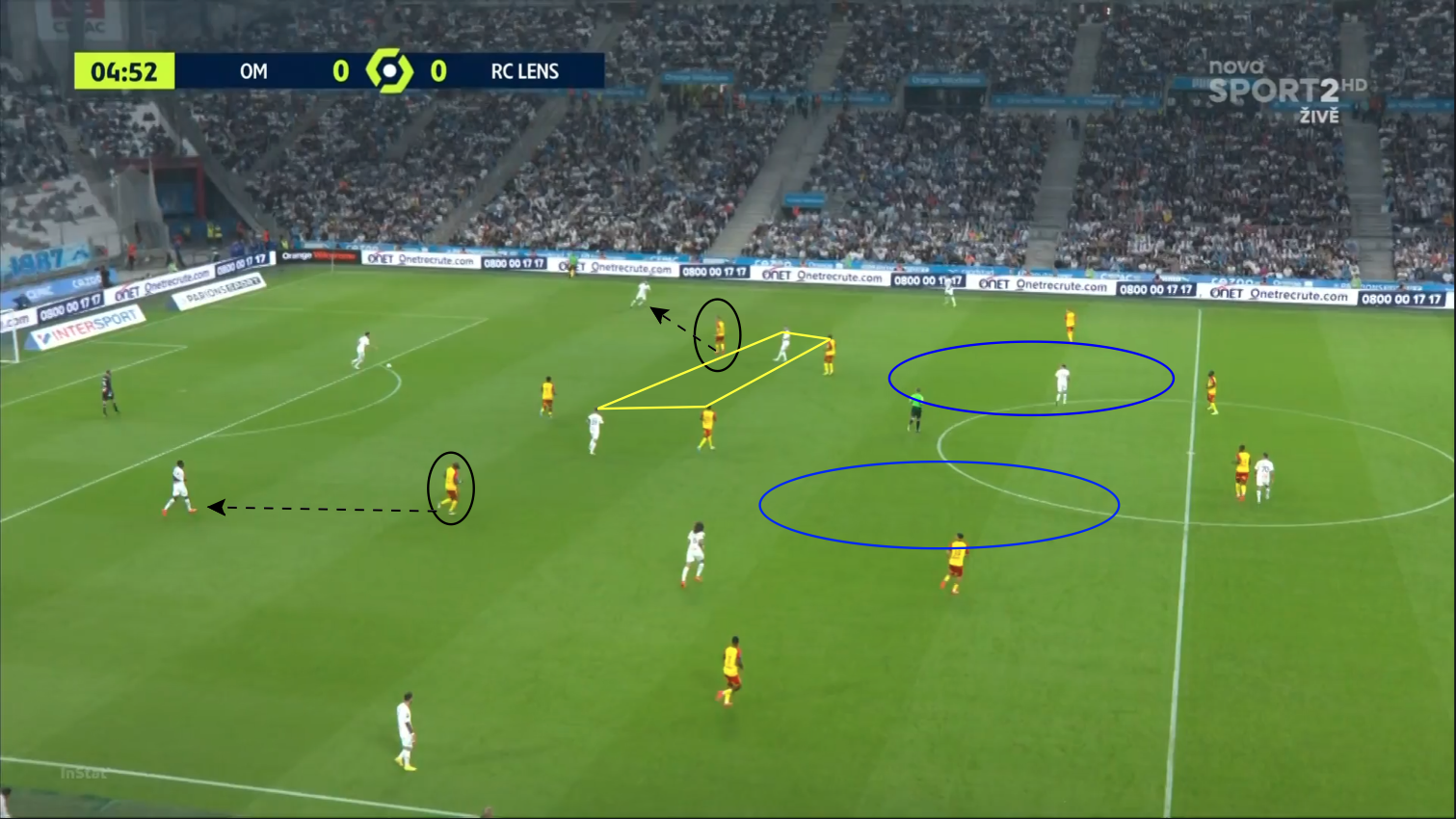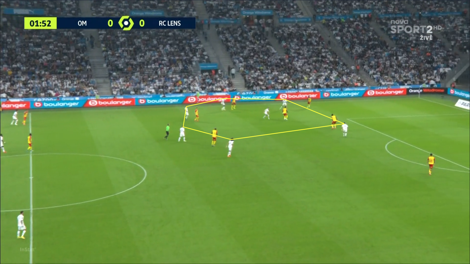 Por lo tanto, a la defensiva, Lente RC Evolucionó en un amplio y alto 532-523 en cuanto pudo, con marcador individual sobre los tres centrales marselleses en la reanudación.