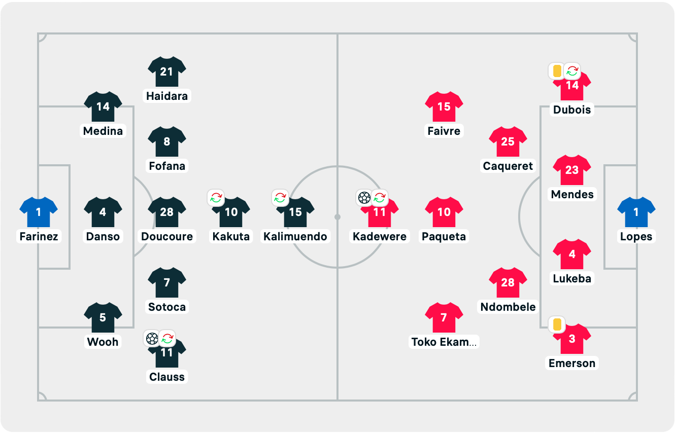 Falta Moussa Dembélé por demasiadas tarjetas amarillas y Tino Kadewere ocupa su lugar en la punta del ataque.